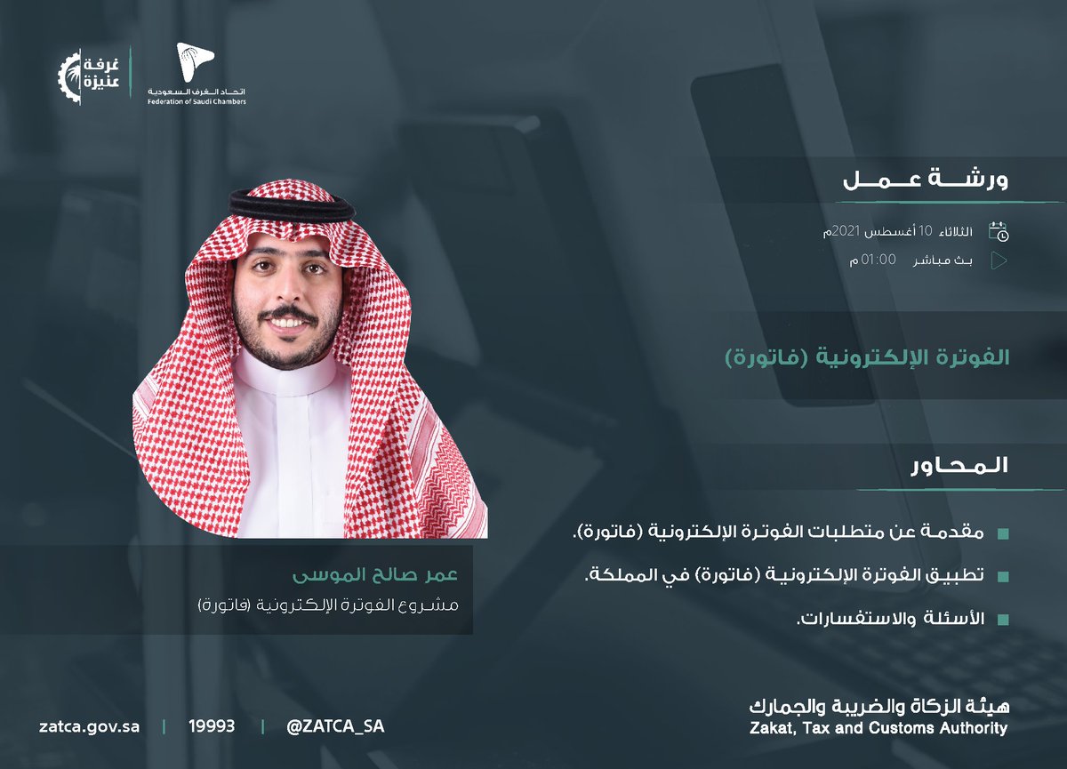 هيئة الزكاة والضريبة والجمارك على تويتر بالتعاون مع غرفة عنيزة ندعوكم لحضور ورشة عمل افتراضية بعنوان الفوترة الإلكترونية فاتورة وذلك يوم الثلاثاء 10 أغسطس 2021م الساعة 1 00م للتسجيل Https T Co Rudp7kcsre زاتكا Https T Co Cemvcshhvz